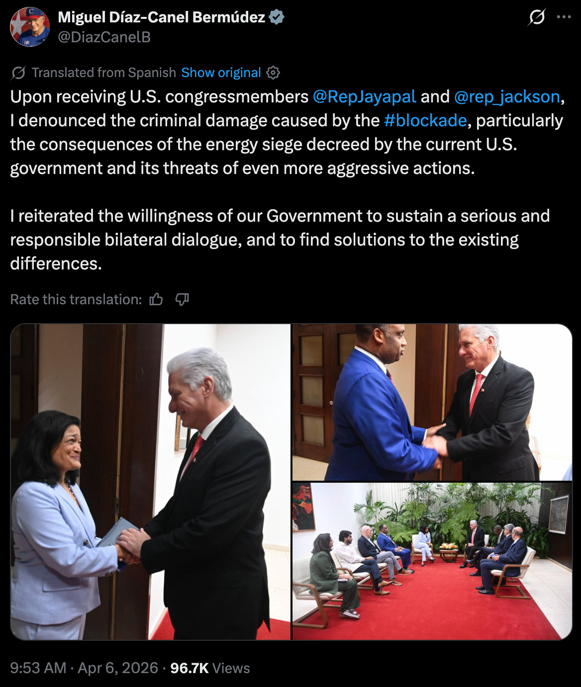 The two lawmakers, Congresswoman Pramila Jayapal of Washington and Jonathan Jackson of Illinois, issued a joint statement addressing the visit, calling the Trump administration’s policy toward the island an “economic bombing.”