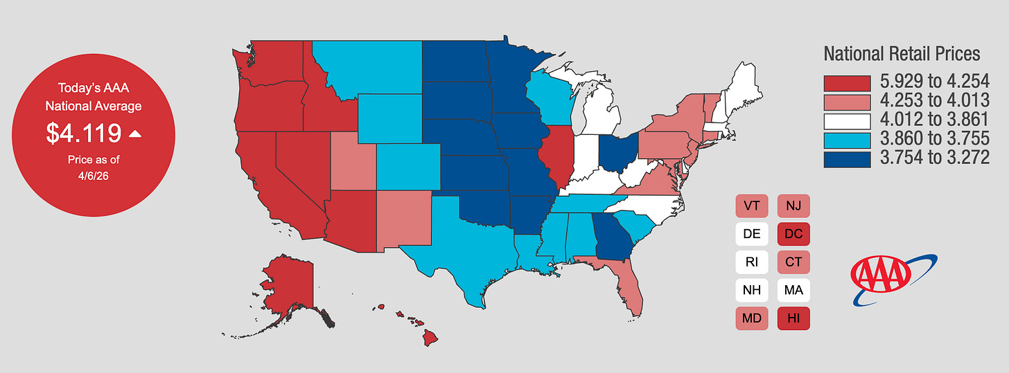 -The average U.S. gas price stood at $4.11 yesterday amid the ongoing war in the Middle East, according to AAA.