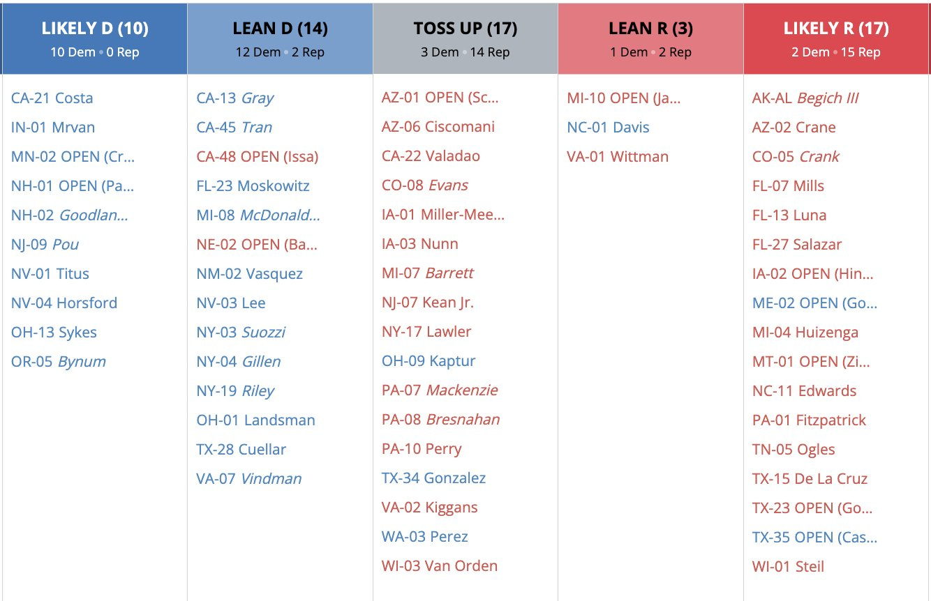 -According to the Cook Political Report, House Republicans would need to win 76% of the races it lists as “Toss Ups” to keep their razor-thin majority in this year’s midterm elections.