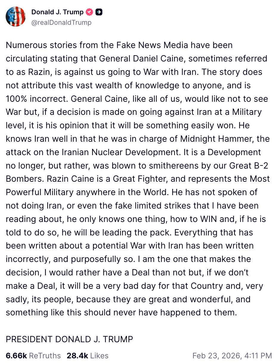 -President Trump pushed back on reports that Joint Chiefs Chairman Dan Caine has advised him against taking military action against Iran in a social media post as tensions between the two countries continue to mount.