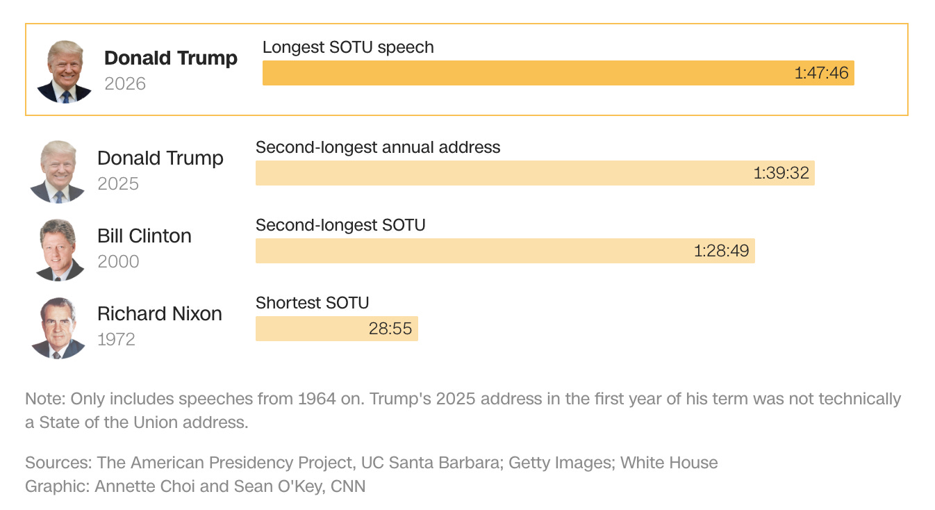 The speech was the longest State of the Union address in history, running 1 hour and 47 minutes, surpassing the record he set last year when he addressed a joint session of Congress.