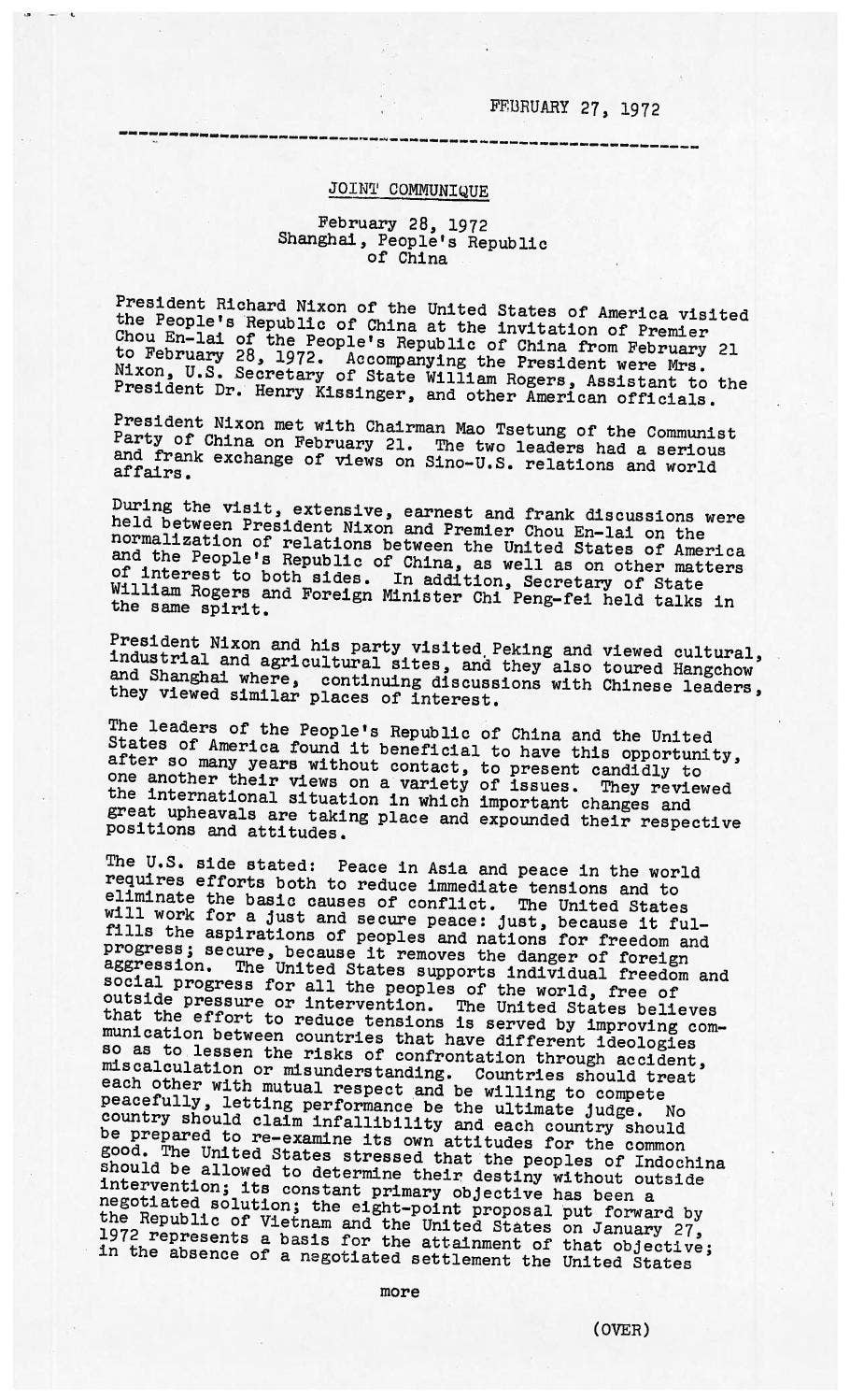 -On this day in 1972, the United States and China issued the Shanghai Communiqué, capping President Richard Nixon’s landmark visit to the People’s Republic of China.
