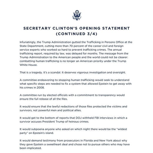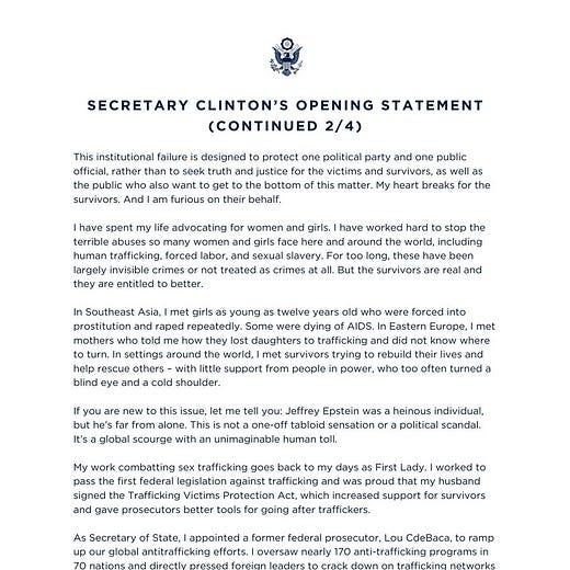 -Former Secretary of State Hillary Clinton testified before the House Oversight Committee yesterday as part of its investigation into Jeffrey Epstein.