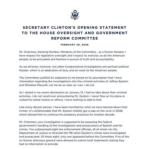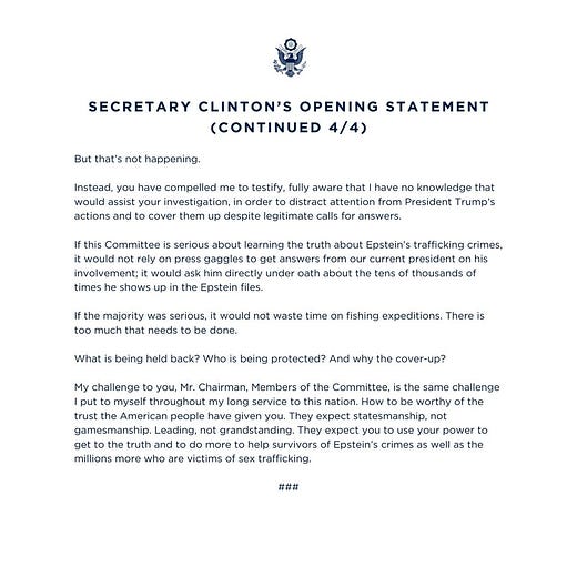 In her opening statement, Clinton said, “I do not recall ever encountering Mr. Epstein. I never flew on his plane or visited his island, homes, or offices. I have nothing to add to that.” She went on to criticize the Republican members of the committee, saying, “You have compelled me to testify, fully aware that I have no knowledge that would assist your investigation, in order to distract attention from President Trump’s actions and to cover them up despite legitimate calls for answers.”