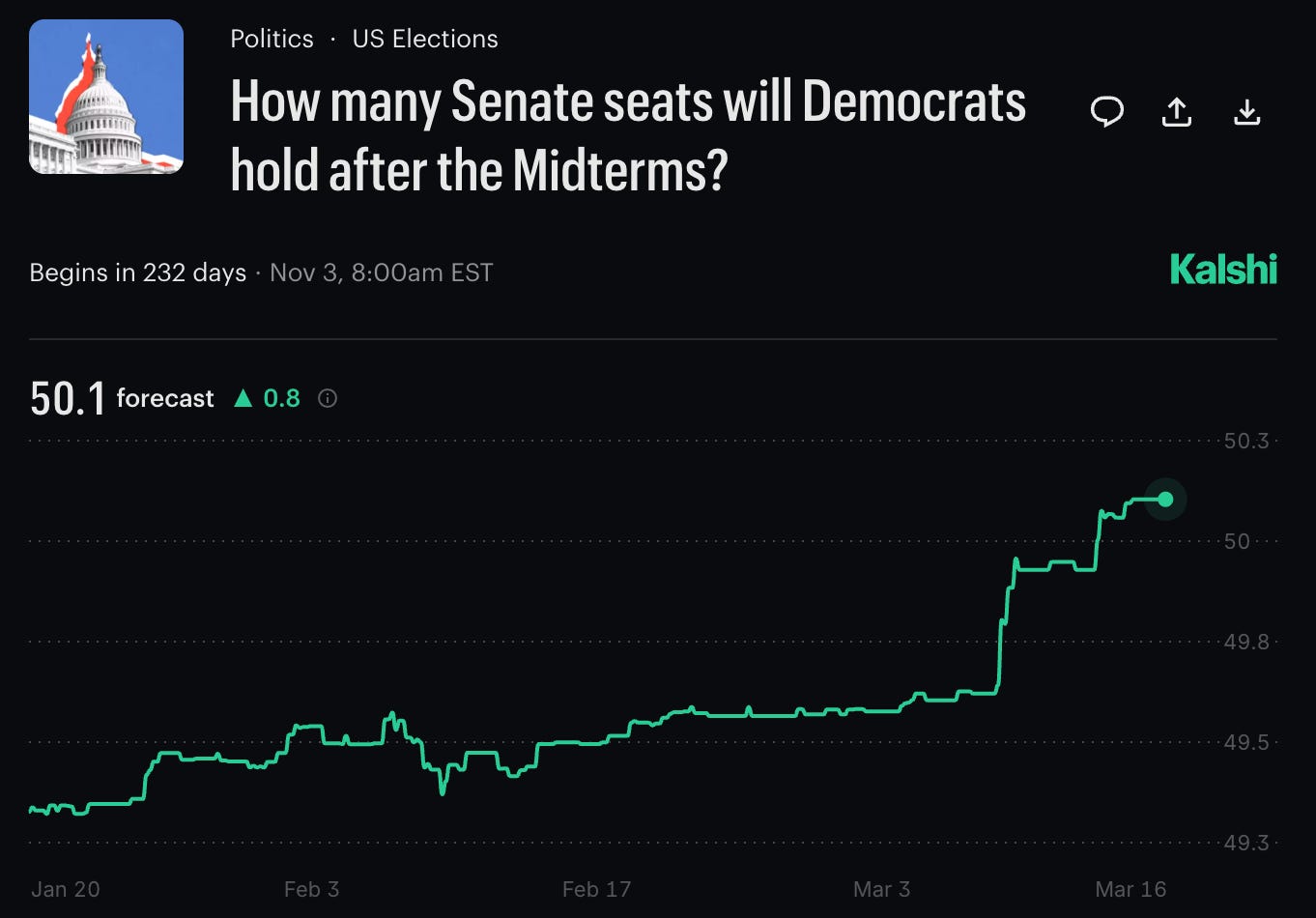 -Democrats now lead prediction markets for control of the United States Senate, overtaking Republicans on leading betting platforms Kalshi and Polymarket.