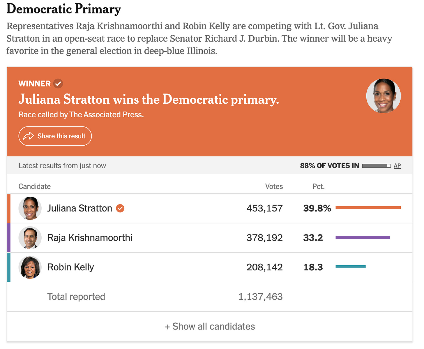 -Illinois Lieutenant Governor Julianna Stratton won the Democratic nomination for the U.S. Senate following yesterday’s vote, emerging from a crowded primary field.