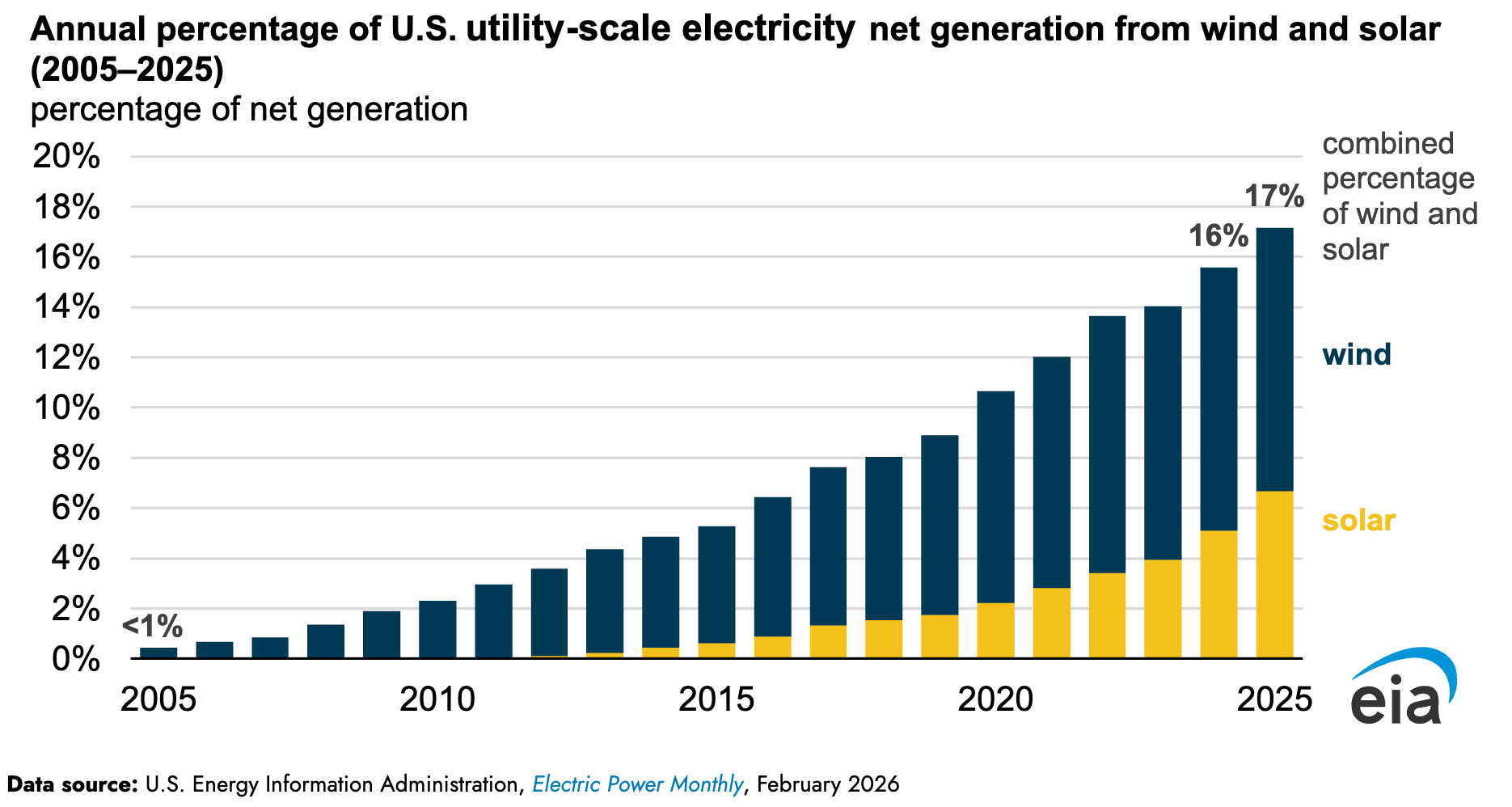 -Wind and solar energy generated a record 17% of electricity in the United States last year, according to the Energy Information Administration.