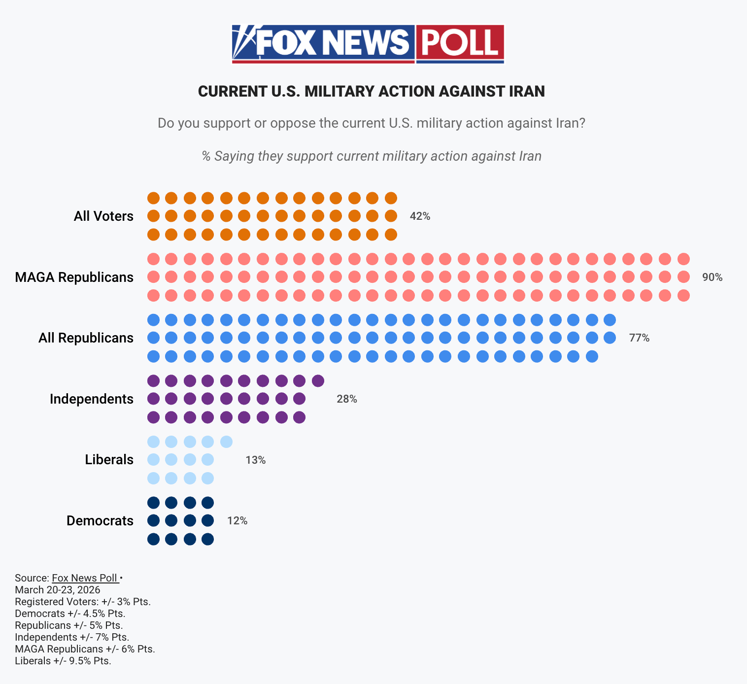 According to a new Fox News poll, only 42% of voters support the “current U.S. military action against Iran.”