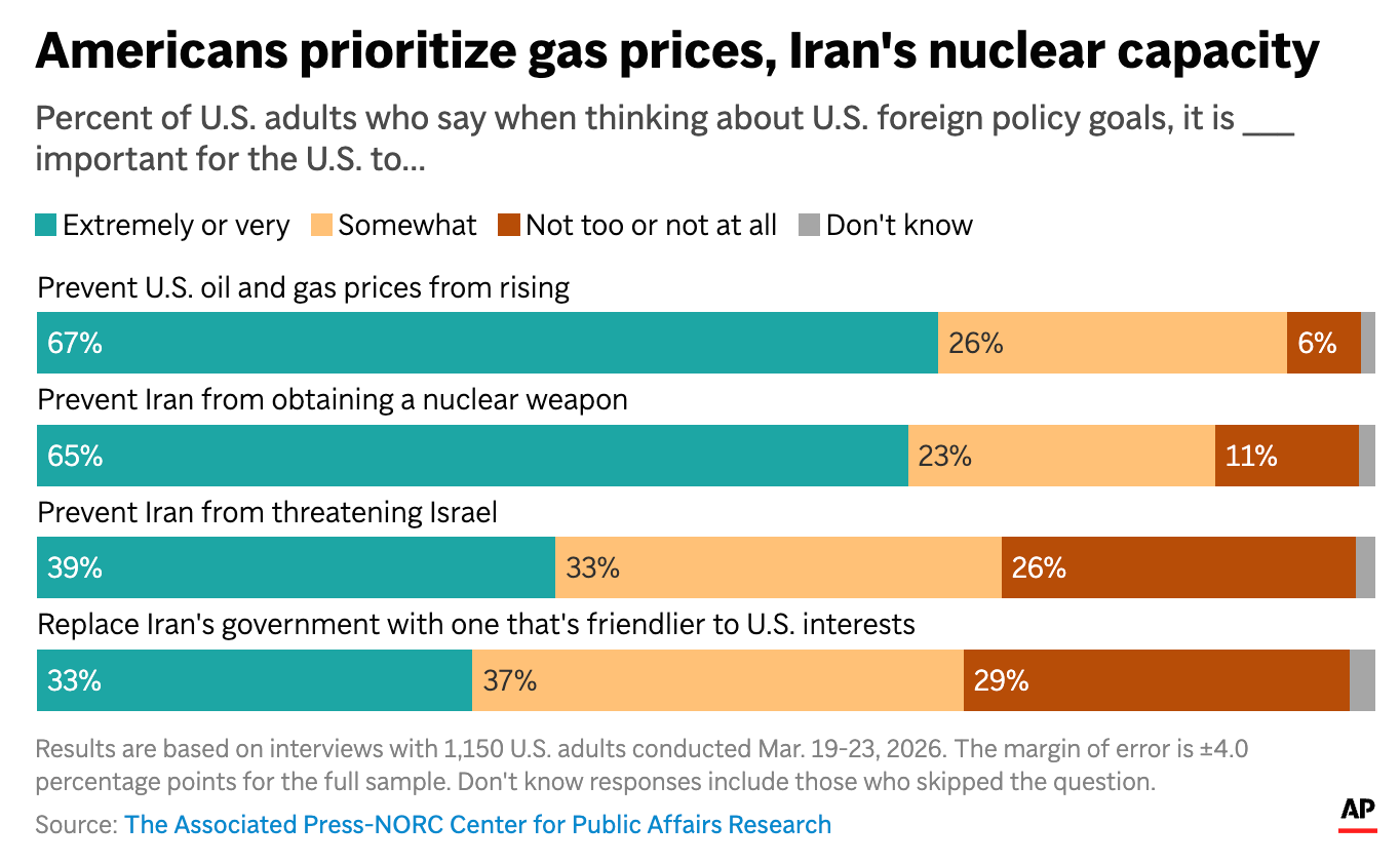 -Over two-thirds of Americans believe that the Trump administration should prioritize preventing gas prices from rising, while nearly as many say it is important to prevent Iran from obtaining a nuclear weapon, according to a new AP/NORC poll.