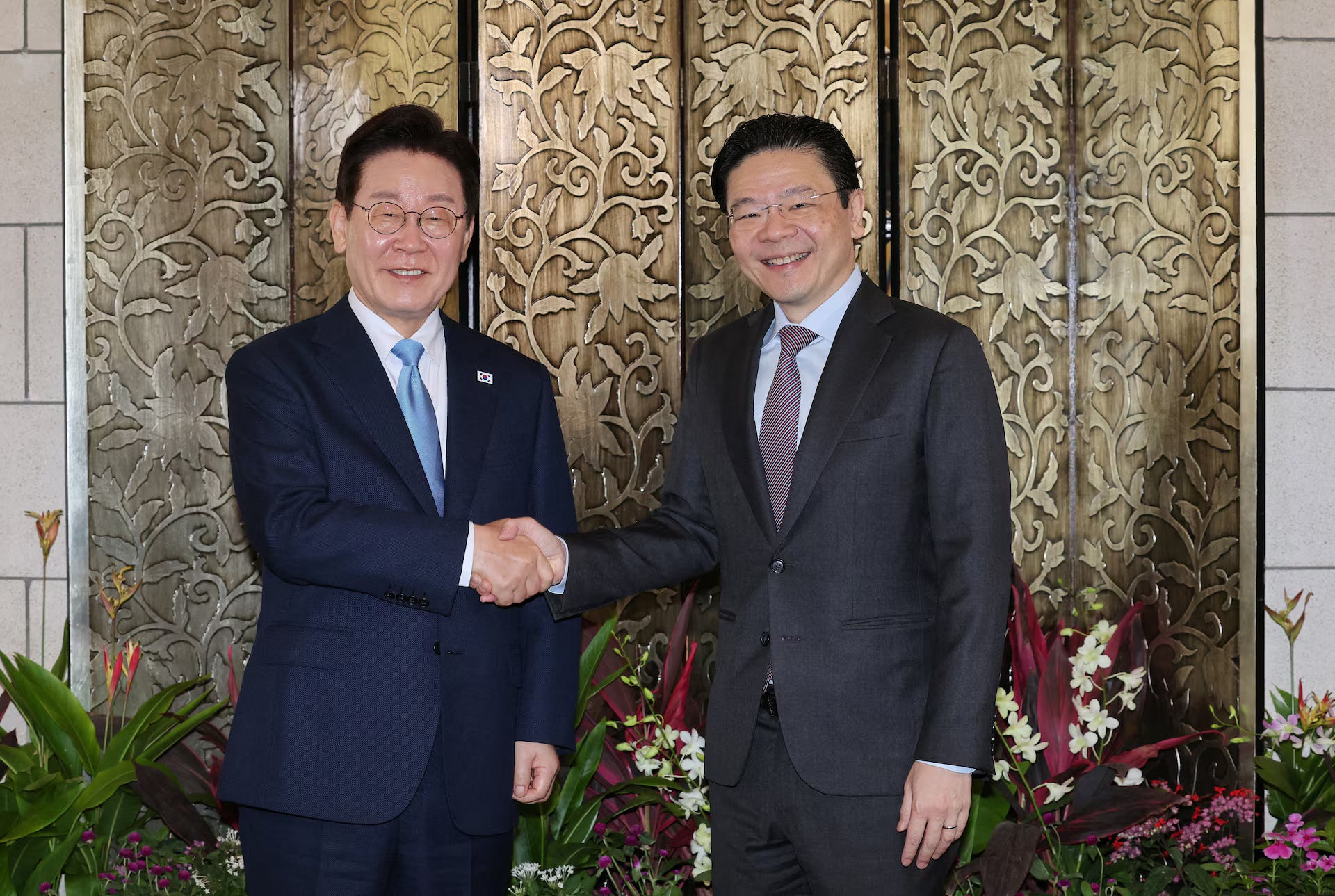 -South Korean President Lee Jae Myung and Singaporean Prime Minister Lawrence Wong met yesterday for a summit meeting focused on artificial intelligence and nuclear energy as part of Lee’s state visit to the city-state.