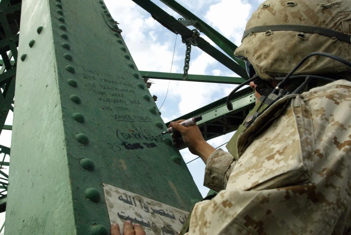 The subsequent broadcast of their mutilated bodies being dragged and hung ignited public outrage in the United States. The incident led President George W. Bush to launch Operation Vigilant Resolve, which shifted U.S. counter-insurgency operations in the war.
