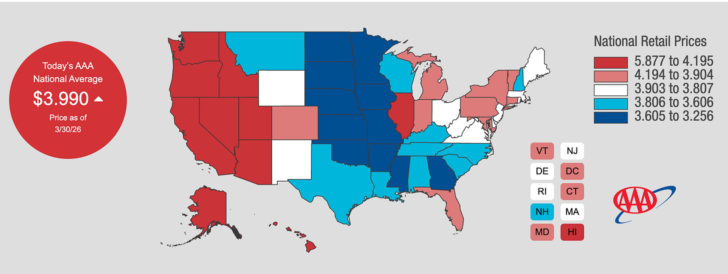 -The average U.S. gas price stood at $3.99 yesterday amid the ongoing war in the Middle East, according to AAA.