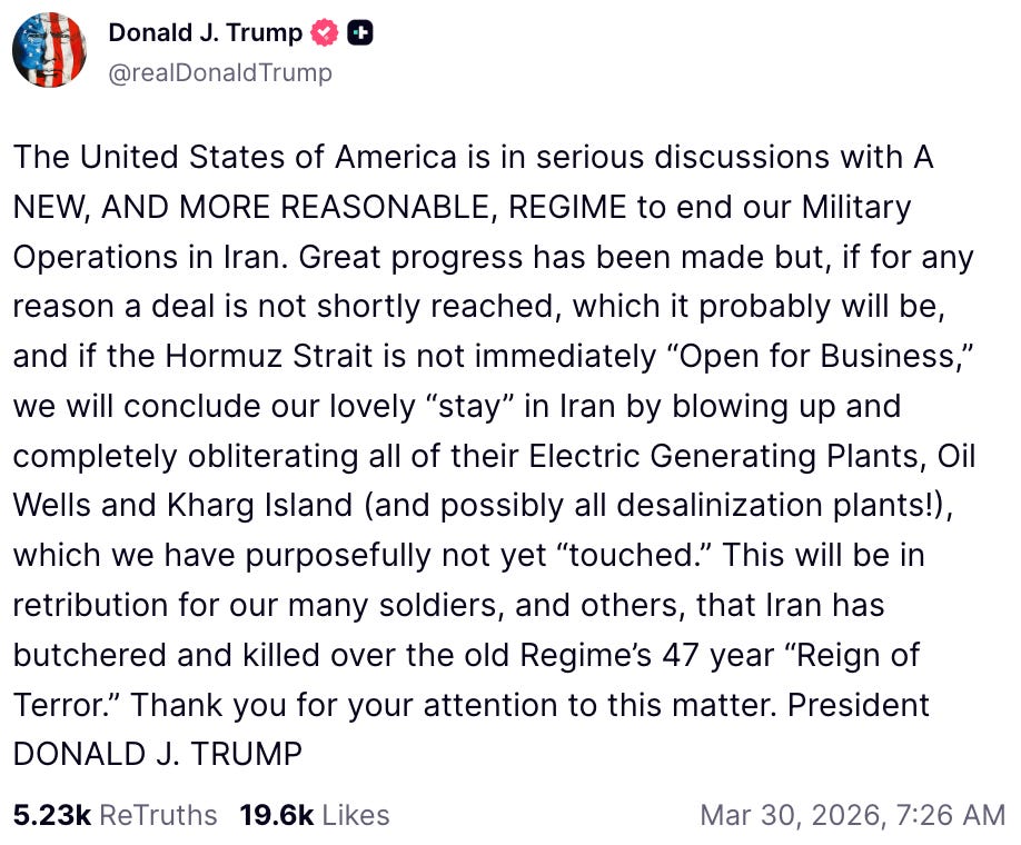 -President Trump said yesterday that Washington was in “serious discussions” to end its war with Iran. He added that if a deal was not struck, then he would order strikes on the country’s oil and electric infrastructure.