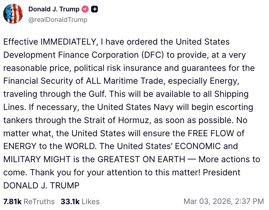 As prices rise, Washington has sought to offset further increases, with Trump saying his administration would extend “political risk insurance and guarantees” for energy tankers and other ships transiting the strategic Strait of Hormuz.