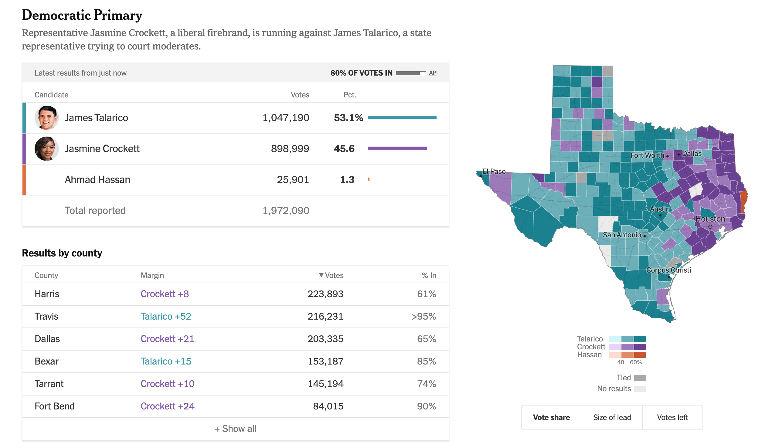 In Texas, State Representative James Talarico holds a lead over Congresswoman Jasmine Crockett in the Democratic primary contest for the U.S. Senate, with CNN projecting a Talarico win.