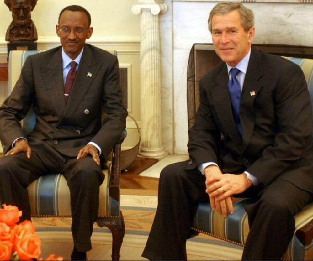 In 2003, President George W. Bush met with Rwandan President Paul Kagame in the Oval Office, where the two leaders discussed ongoing efforts to rebuild the East African country following the 1994 genocide.
